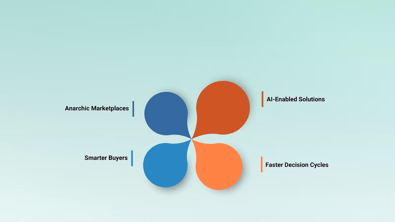 - Anarchic Marketplaces: Customers are receiving cold calls, emails, and LinkedIn messages on a daily basis. Breaking through the clutter, salespeople must utilize sharper, more focused tactics that break the status quo.