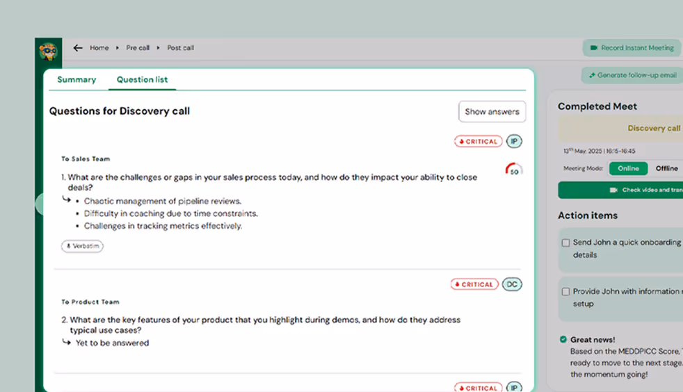 Pepsales AI accelerates onboarding by automatically generating pre-built, sales framework-aligned discovery questions, personalized call agendas, and buyer-specific insights before every meeting. New reps walk in confident, equipped with proven frameworks and contextual guidance that shorten ramp time and improve first-call effectiveness, all without manual prep.