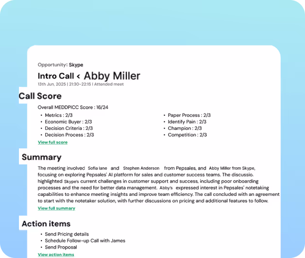 Pepsales AI integrates with 20+ sales methodologies and frameworks like MEDDPICC, MEDDIC, BANT, SPIN, etc., ensuring your team follows proven qualification processes.