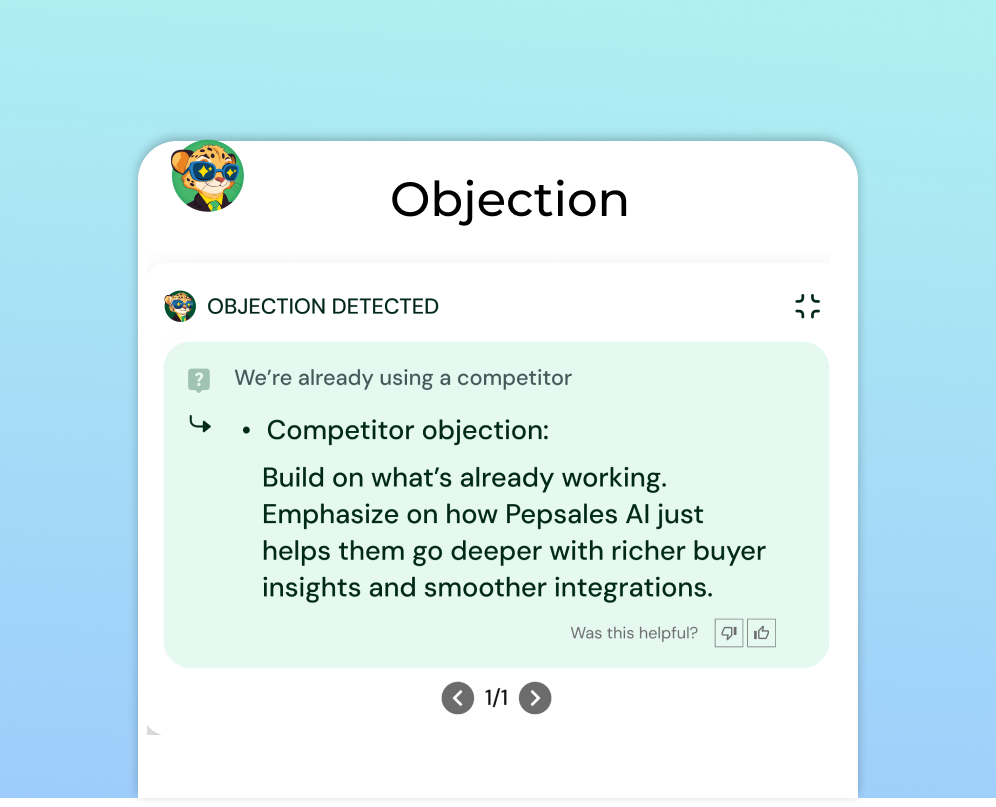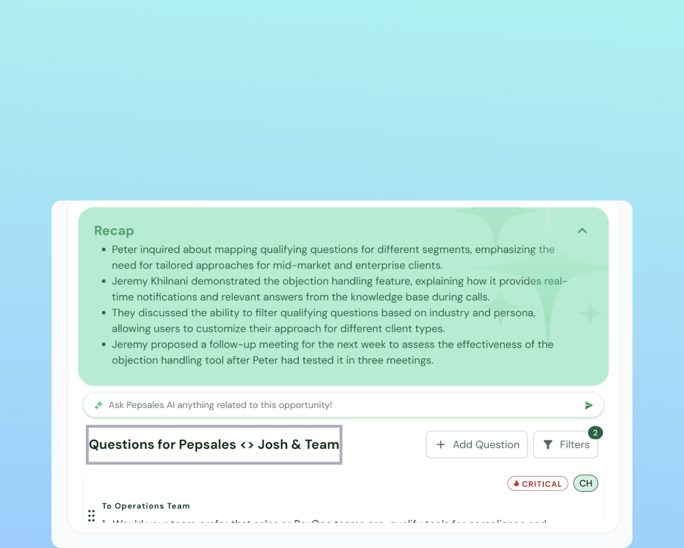Pepsales AI combines sales intelligence with real-time guidance, so reps don’t just log conversations; they get coached through them. Unlike Salesloft, it identifies objections, surfaces buying signals, and offers next-step nudges, making it the top Salesloft alternative for performance-driven teams.