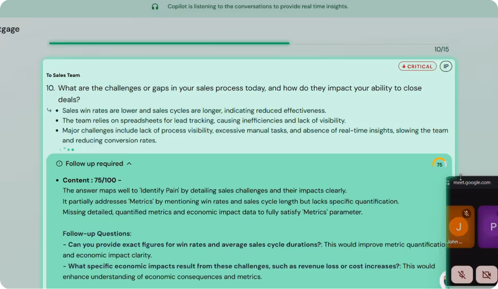 Get discovery and follow-up questions, so your reps never miss a critical qualification moment. Stay aligned with your framework while keeping the flow natural and buyer-focused.