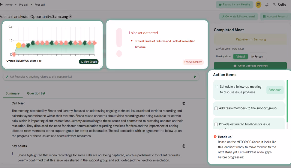 Pepsales AI’s On-Call Copilot provides live cues, reminders, and question prompts during the call - helping reps stay sharp, handle objections instantly, and keep conversations moving.