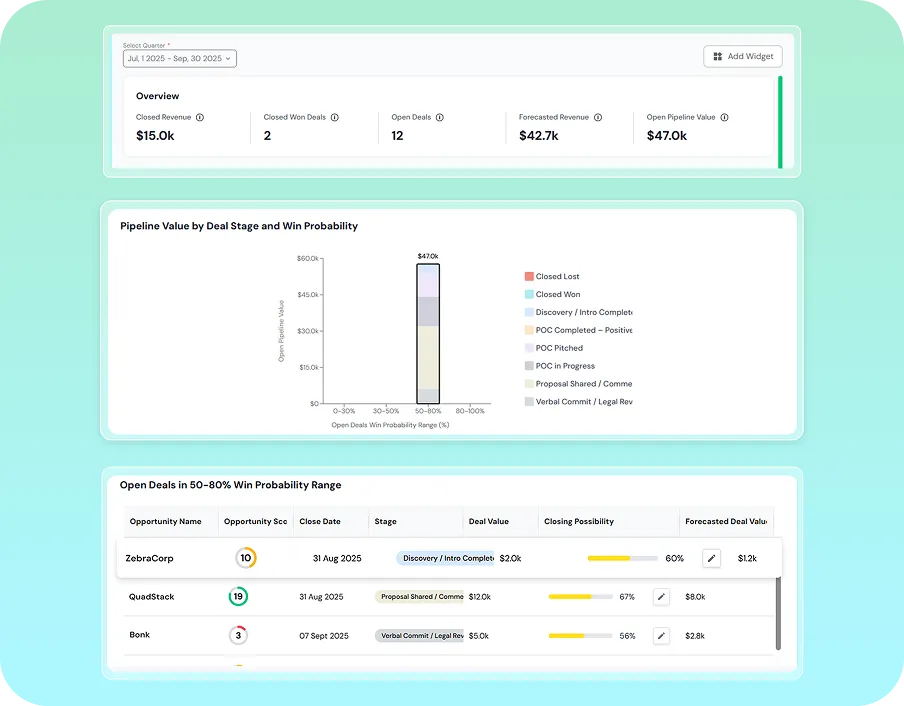 Centralized Insights: View all deals, stages, and next steps in one dashboard. Spot stalled opportunities instantly.