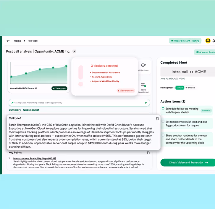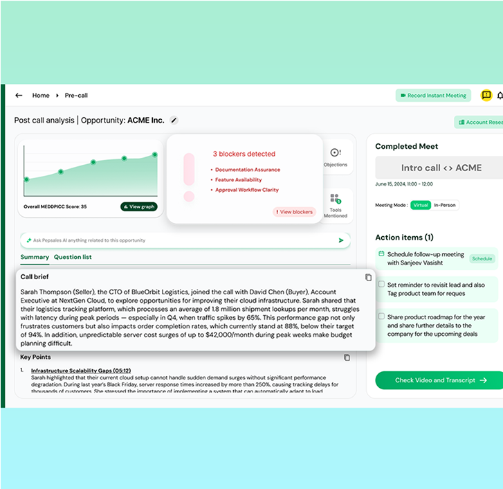 After the call, the Pepsales Discovery Co-pilot analyzes the meeting and gives you a detailed summary, including suggestions for improvement, a discovery score, and insights to help move deals closer to a win. It also updates your CRM automatically. Voila!